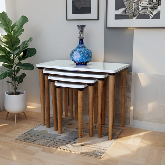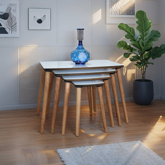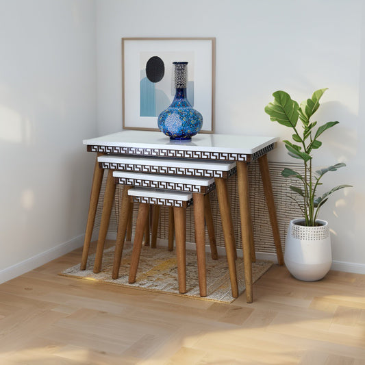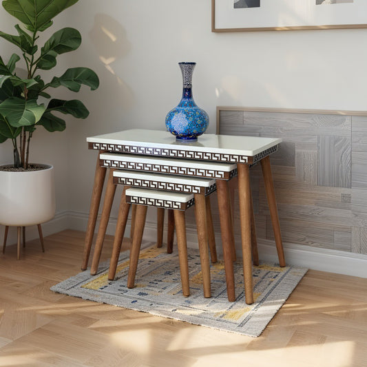 Evmob Lüks 1. Sınıf Mdf Oymalı 4’lü Zigon Sehpa Seti – Beyaz & Ceviz, Modern Tasarım