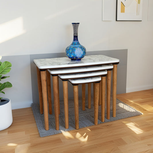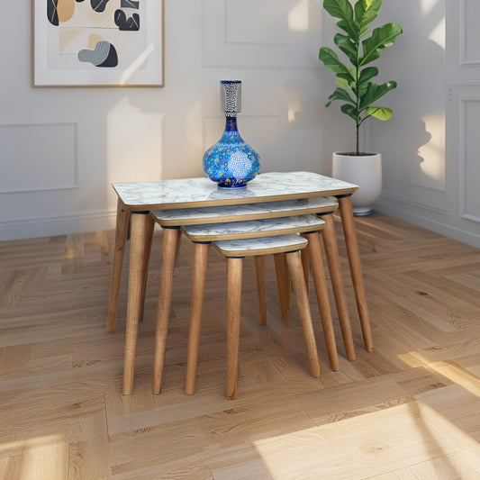 Evmob Lüks 1. Sınıf Mdf Tek Katlı 4’lü Zigon Sehpa Seti – Beyaz Mermer & Ceviz, Modern Tasarım
